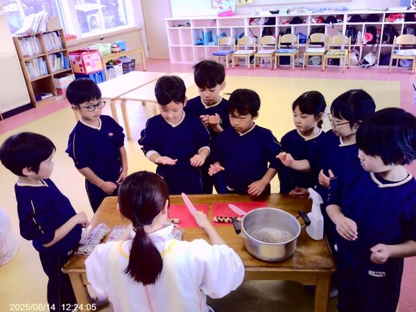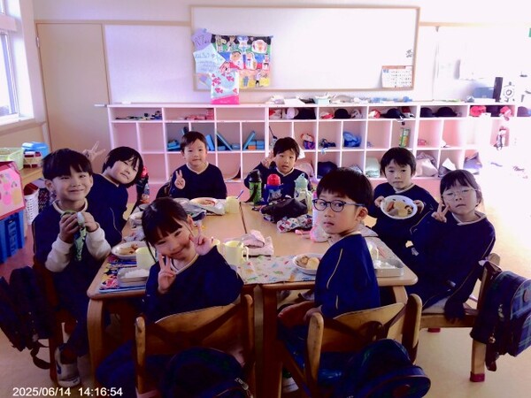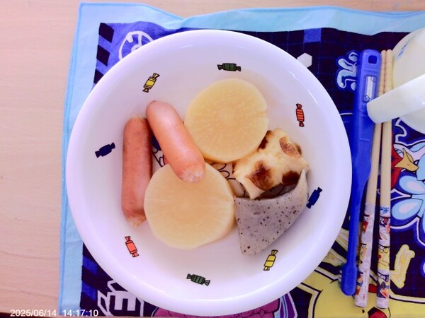 子どもたちには大根の収穫や、きれいに洗ったり、ちくわを切るお手伝いもしてもらいました。大根を収穫している際には、「すごーい!」「大きいのも小さいのもあるね☻」いろんなお話をしていました。ほかのクラスや先生方におでんを渡す時もおでん屋さんとして任務を果たしてくれました。「おいしかった!」と皆にたくさん喜んでもらって大満足なゆりさんでした❁