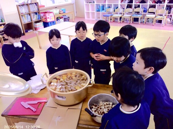 ゆり組で育てた大根が大きく育ち、「皆でおいしく食べたい!」と言って、クラスでおでんを作りました☻