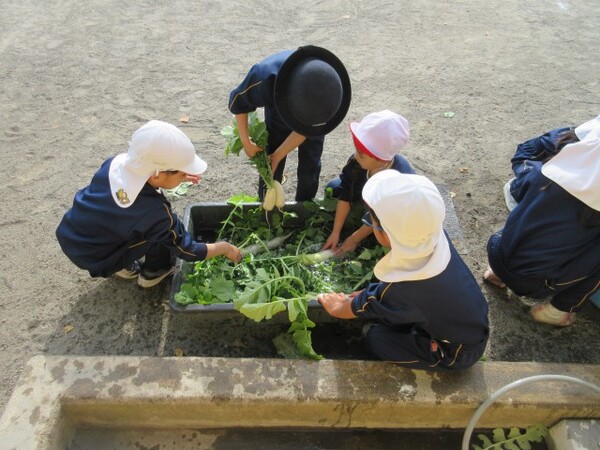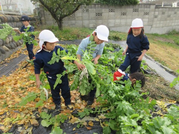 子どもたちには大根の収穫や、きれいに洗ったり、ちくわを切るお手伝いもしてもらいました。大根を収穫している際には、「すごーい!」「大きいのも小さいのもあるね☻」いろんなお話をしていました。ほかのクラスや先生方におでんを渡す時もおでん屋さんとして任務を果たしてくれました。「おいしかった!」と皆にたくさん喜んでもらって大満足なゆりさんでした❁