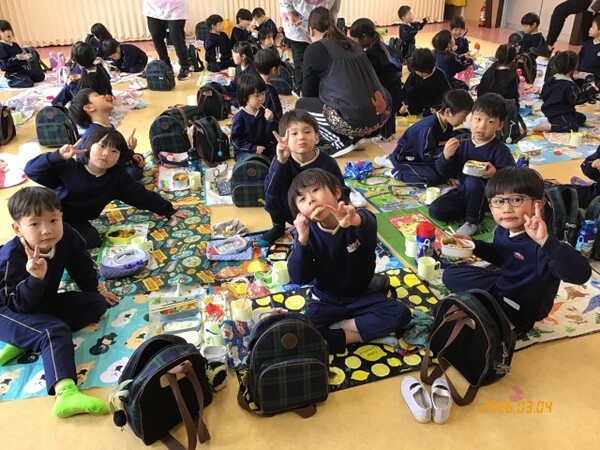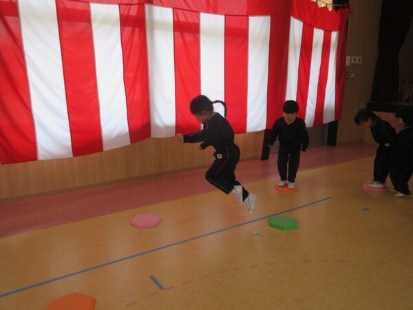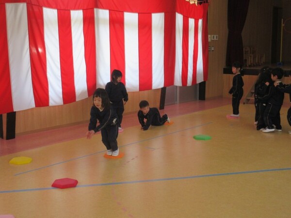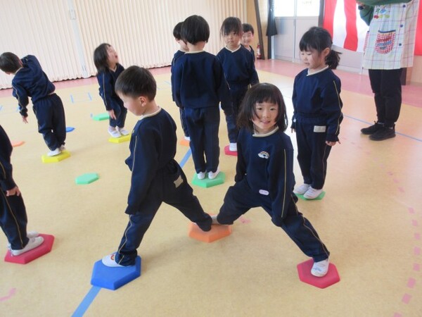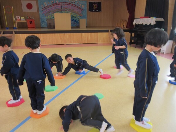 すみれ組最後の今日、みんなで飛び石ゲームで遊びました。今までも何度か遊んできたので、今日は少し間をあけて難易度を難しくしてみました。途中で落ちてしまっても、ゴールにたどり着けるまで何度も挑戦しました。悔しくて泣いてしまうお友達がいても、「がんばれー!」とみんなで励ましあっている姿に、一年間の成長を感じられました。💓