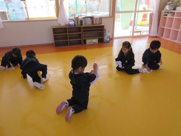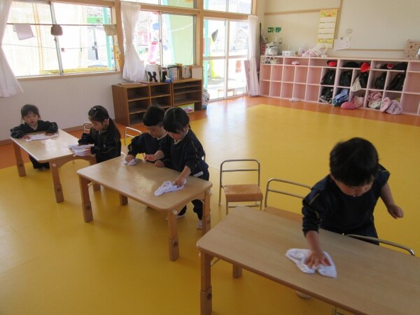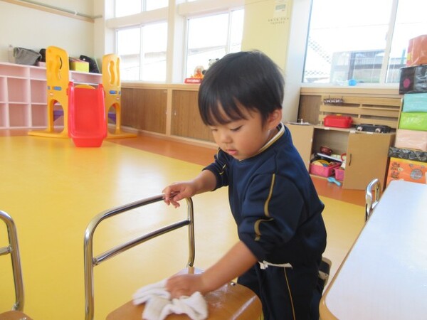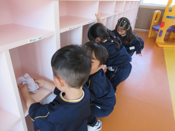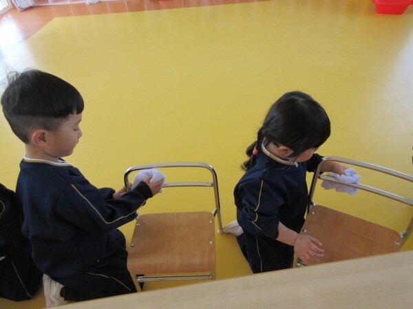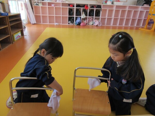 12日にひよこ組で過ごすのも残りわずかなことを話しました。毎日使っていたロッカーや椅子、机などに今までありがとうの気持ちを持ち、今度新しいひよこ組のお友達が来て、きれいなお部屋で使えるようにみんなでお掃除をすることを伝えました。
