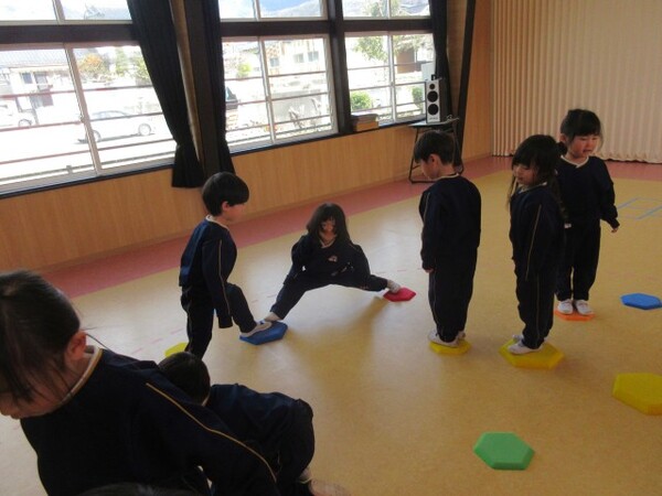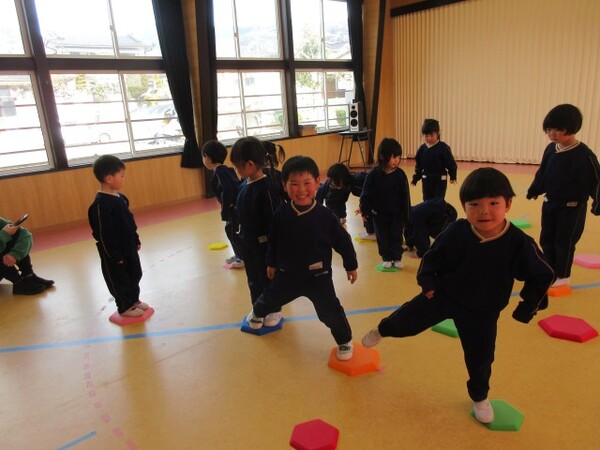 音楽にあわせて動くゲームでは、お友達と同じ飛び石に乗って落ちそうになるのを我慢したり、全身を使って移動していた子も、バランスをとりながらゲームを楽しんでいました。😊