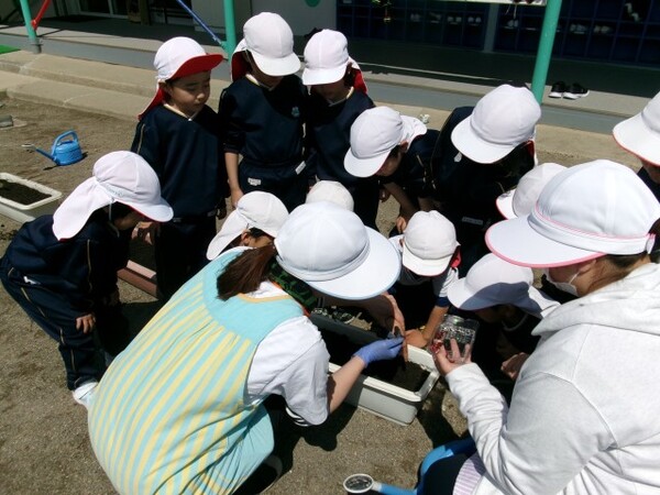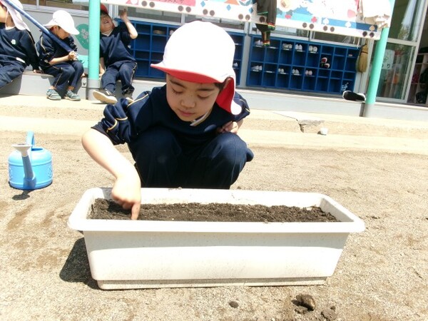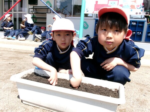 種や苗がどんな形か、どんな色をしているか興味を持ちながら、手で土に触れて子どもたちが丁寧に植えてくれました🌱やさしく土の布団をかぶせながら、「おおきくなってね〜」と声を掛けました♪