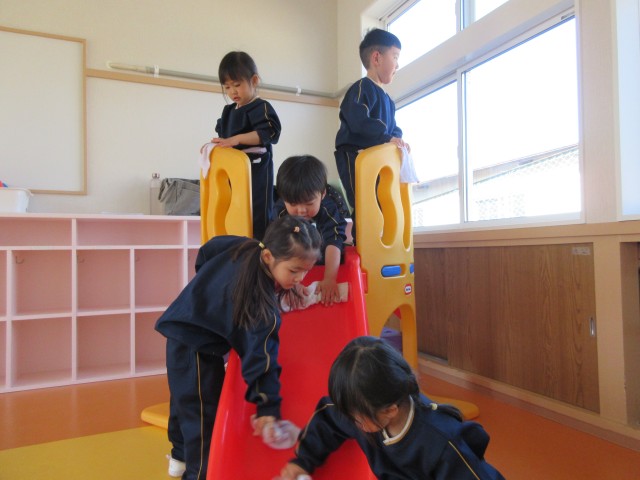 まずは、毎日使っていたロッカー、椅子、机を雑巾で拭きました。全部終わったお友達は自分から「次ここも拭くね。滑り台もやるね。」と言い自分達で積極的に気付いて色々な所を拭いてお掃除してくれました。