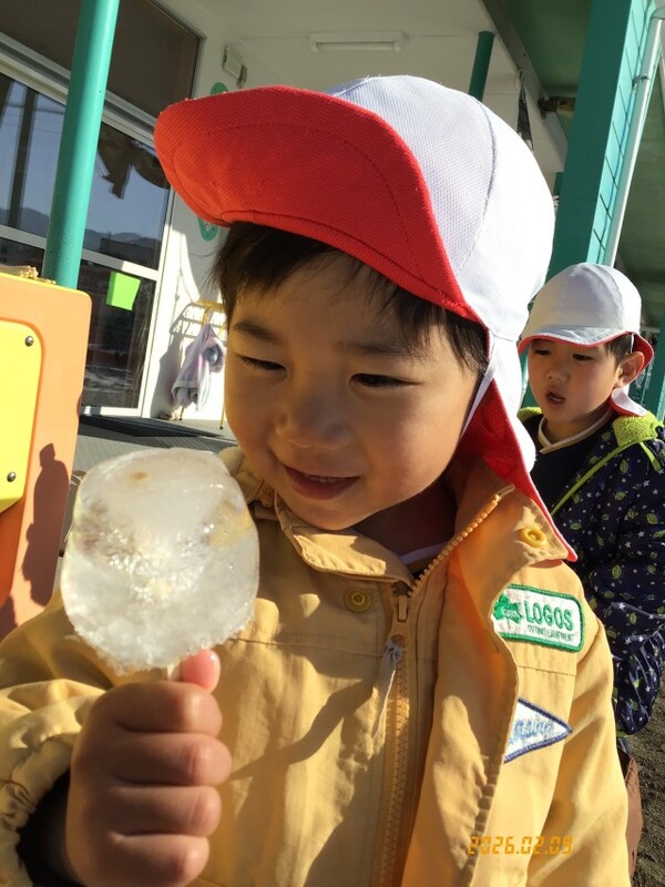 次の日、登園してみると水がカチコチに凍ってきれいな氷になっていました!!スポッと容器から外して手で持つと「つめた〜い!」「きらきらしているね!」と子どもたちは大喜び♪