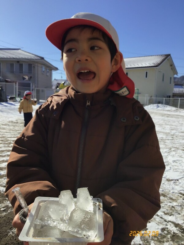 様々な大きさ・形の氷ができて、見て触って楽しむ姿がみられました。冬ならではの遊びも楽しいですね♪できた氷を重ねて【こおりのケーキ】や【かき氷屋さん】になったりして楽しみました🐧