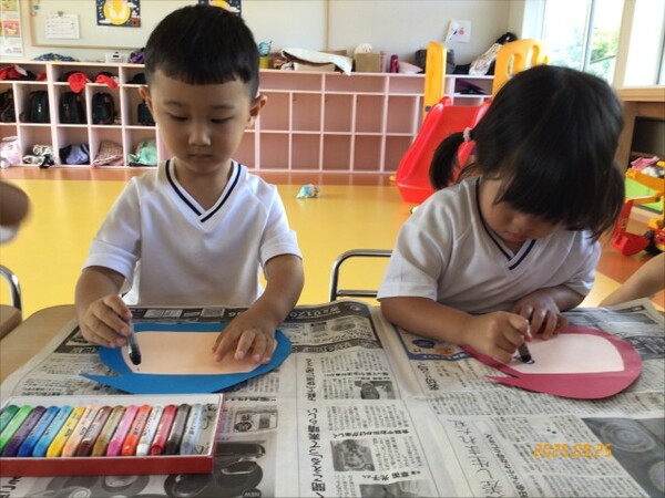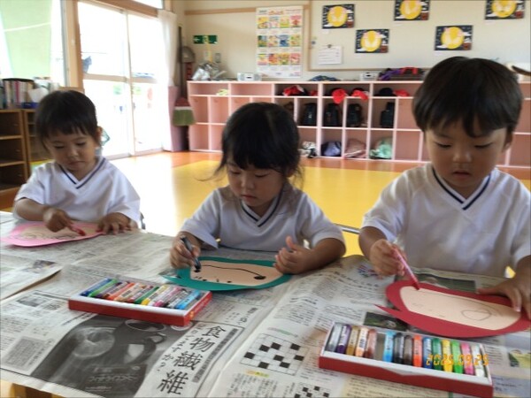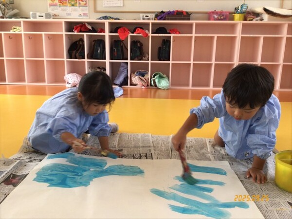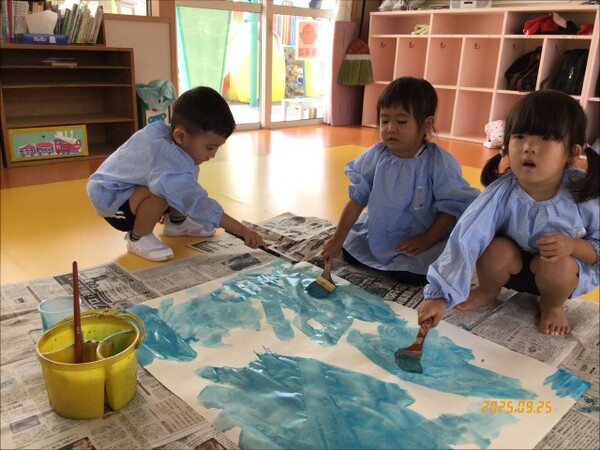 「僕は、赤忍者」「私は、ピンク忍者」と言いながら、自分達の忍者の顔に髪の毛や目、口を描いたり、大きな国旗に絵の具を使ってハケや筆で色塗りをしました。