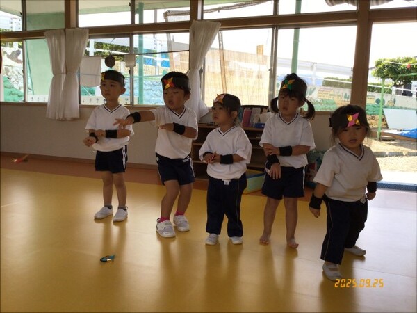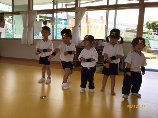 ひよこ組は、初めての運動会ですが、毎日すみれ組のお兄さん・お姉さん達と一緒に楽しく競技を楽しんでいます。